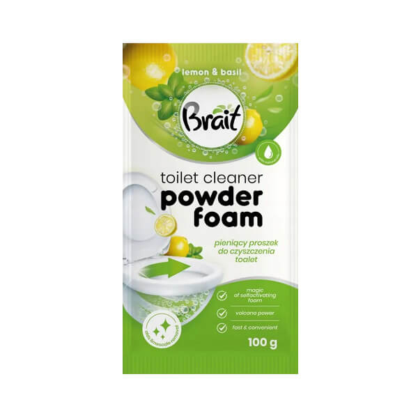 Brait moćni prah za čišćenje WC-a Lemon & Basil 100 g inovativno čisti WC školjku i ostavlja svjež miris. Njegova formula učinkovito uklanja naslage, kamenac i prljavštinu bez ribanja. Prah intenzivno pjeni i doseže teško dostupna mjesta, a aktivni dezinfekcijski sastojci uklanjaju bakterije i sprječavaju nastanak kamenca. Jednostavno ga uspite u WC, pričekajte nekoliko minuta i isperite vodom. Siguran je za cijevi i ekološki prihvatljiv.