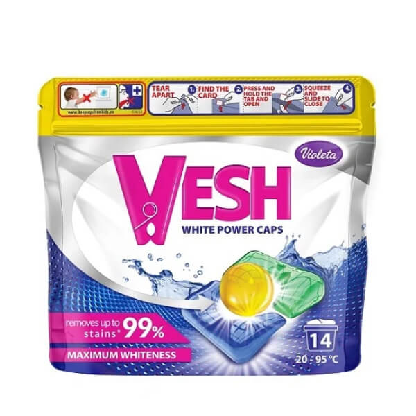 VESH WGITE KAPSULE za pranje bijelog rublja čuvaju intenzitet i blistavost boja odjeće te efikasno uklanjanju tvrdokorne mrlje i na niskim temperaturama.