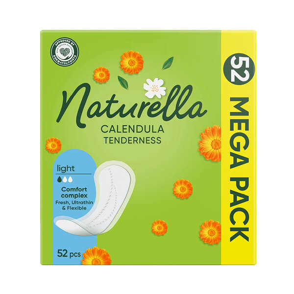 Želite li da vas cijelog dana prati ugodan osjećaj svježine, isprobajte prozračne dnevne uloške Naturella Normal Calendula Tenderness s blagim mirisom nadahnutim cvijetom nevena. Njihov površinski sloj mekan poput cvjetnih latica nježan je u dodiru s kožom, što je potvrdio i njemački dermatološki institut za testiranje proDERM. Premda su tanki tek 0,9 mm, dnevni ulošci Naturella Normal Calendula Tenderness osiguravaju pouzdanu zaštitu donjeg rublja od vaginalnog iscjetka, neredovite mjesečnice i iscjedka prije mjesečnice. Za podjednako nježnu zaštitu tijekom mjesečnice isprobajte higijenske uloške Naturella.