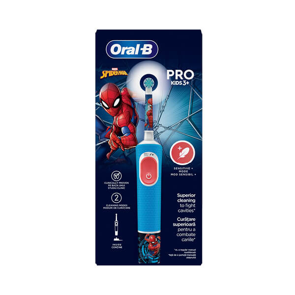 Oral-B PRO Kids dječja električna četkica za zube Spiderman, namijenjena je djeci uzrasta od 3+ godine. Električna četkica za zube uklanja više naslaga od obične četkice. Posebno je prilagođena nježnim dječjim zubima i desnima Uz 2 načina rada. Četkica dolazi u popularnom Spiderman motivu s 4 naljepnice koje mogu mijenjati po želji. Uz Oral-B PRO dječju električnu četkicu za zube, stvorit ćete zdrave navike vaše djece od najranijeg uzrasta.