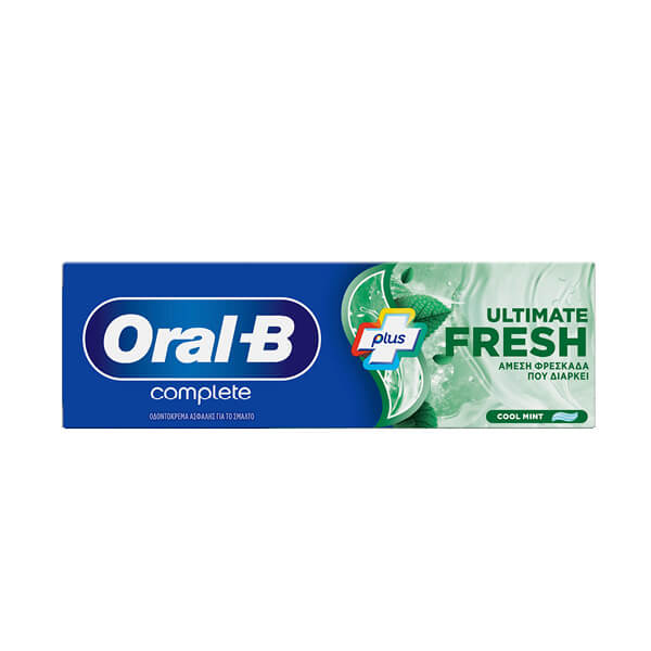 Osvježite svoj osmijeh uz Oral-B Complete ULTIMATE FRESH pastu za zube. Inovativna pasta za zube pruža 24-satnu zaštitu od diskoloracije kada se koristi redovno, dva puta dnevno. Moćna formula prodire čak i u najskrivenije kutke, uklanjajući do 100 % površinskih mrlja, te istovremeno jača zubnu caklinu. Uživajte u naprednom izbjeljivanju i dugotrajnom osjećaju svježine zahvaljujući intenzivnom okusu peperminta. Oral-B Complete ULTIMATE FRESH je klinički testirana i dokazano sigurna za svakodnevnu upotrebu.