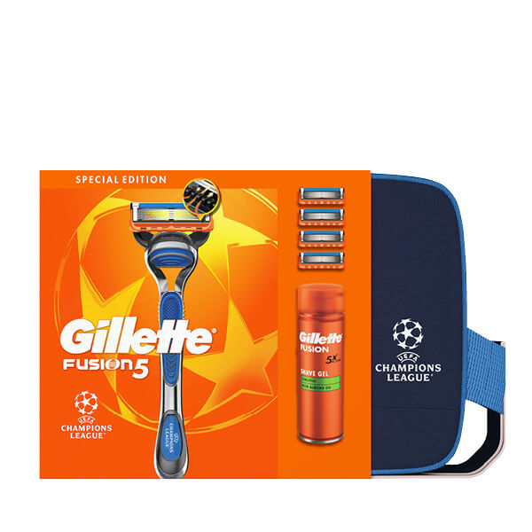 Gillette Fusion5 Champions League Special Edition poklon set za brijanje savršen je poklon za modernog muškarca. Sadrži gel za brijanje (200 ml), brijač, 4 zamjenske oštrice i praktičnu kozmetičku torbicu. Osigurava glatko brijanje, sprječava iritaciju kože i pruža kompletnu njegu lica. Elegantan poklon paket koji spaja funkcionalnost i stil!
